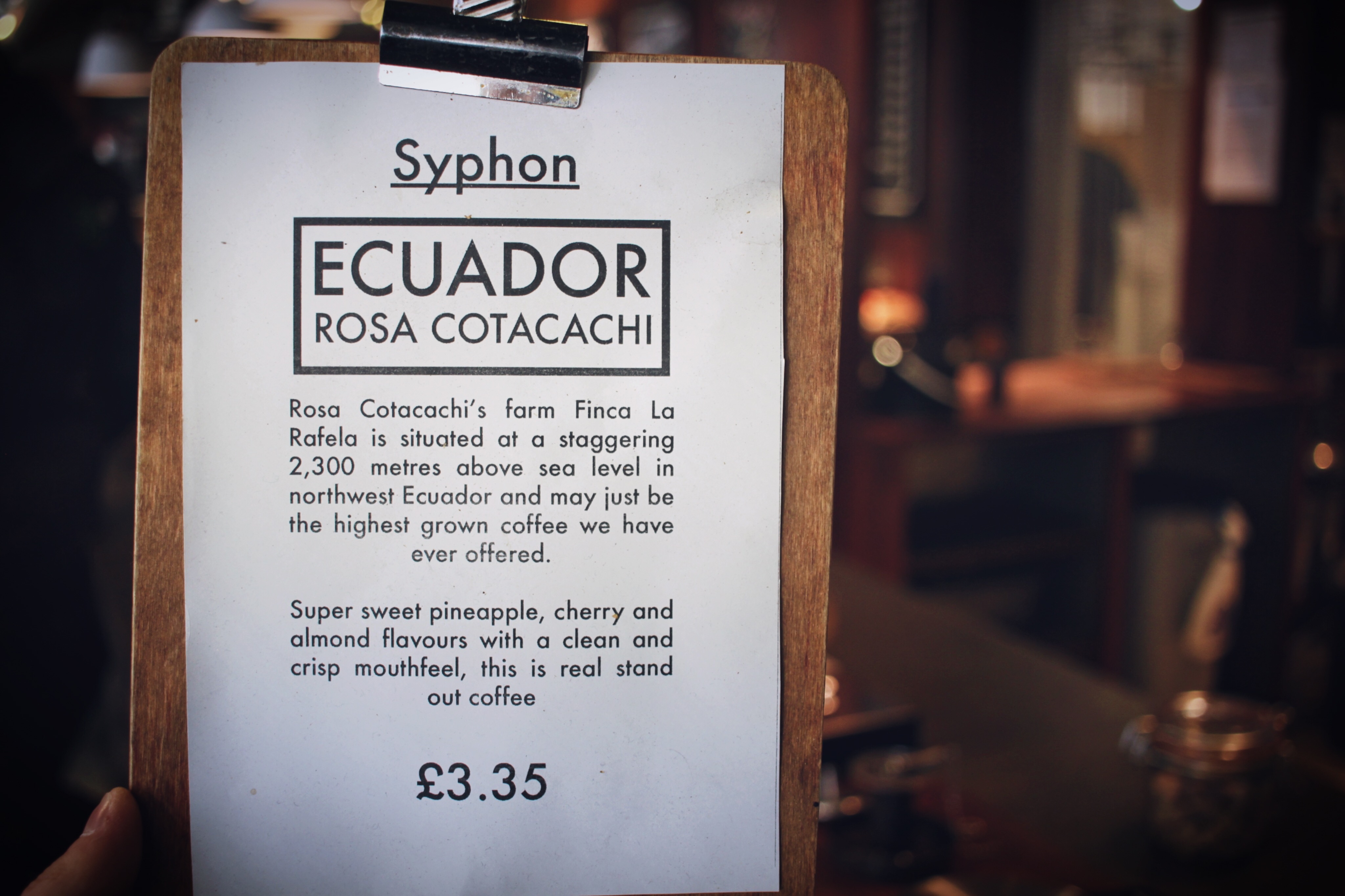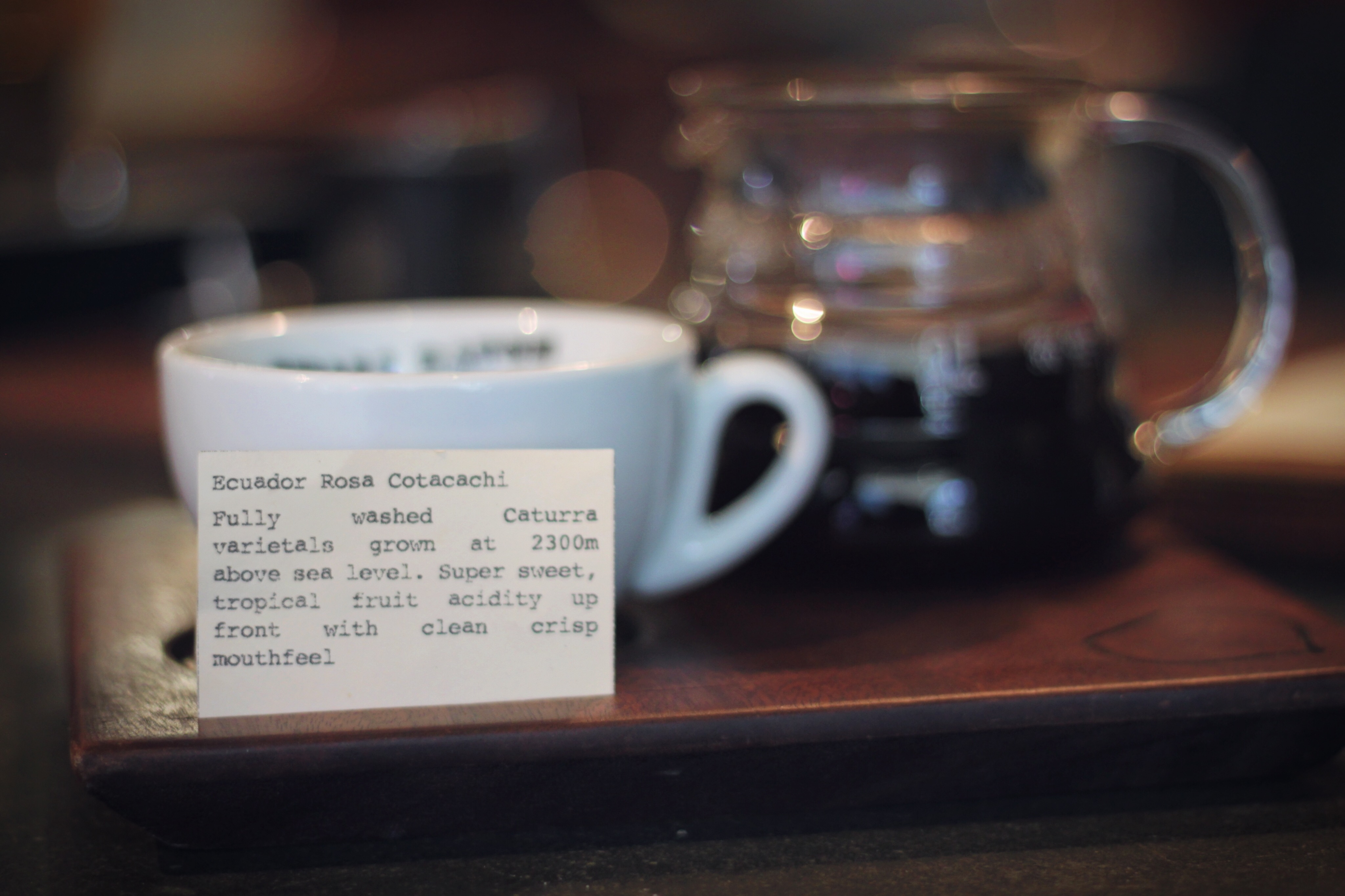 “Fully washed Caturra varietals grown at 2300m above sea level. Super sweet, tropical fruit acidity up front with clean crisp mouthfeel” read the descriptive card that came along with a filled Hario Server and coffee cup. I liked the presentation and must say that it did feel more special than drinking an average cup of coffee. The drink itself delivered on taste; it was fruity and delicious as many third wave coffees are but with a distinct taste that perhaps the siphon method is to be thanked for.